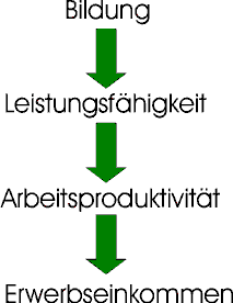 Die Humankapitaltheorie basiert auf der These, dass die Bildungsaktivitäten das Arbeitspotenzial von Erwerbspersonen so verändern, dass deren Arbeitsqualität und -leistung steigt. Diese höhere Produktivität wird im Arbeitsmarkt durch höheren Verdienst entgolten. So wird zumindest partiell die Funktionsweise des Arbeitsmarktes im Falle heterogener Arbeit und die Höhe des individuellen Verdienstes erklärt.